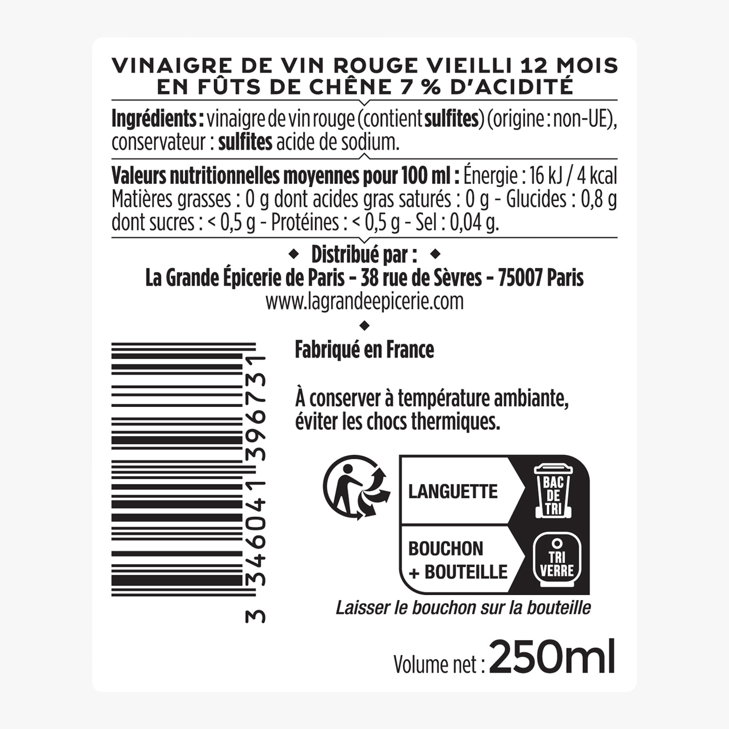 Vinaigre de vin rouge vieilli 12 mois en fûts de chêne 7% d'acidité La Grande Épicerie de Paris