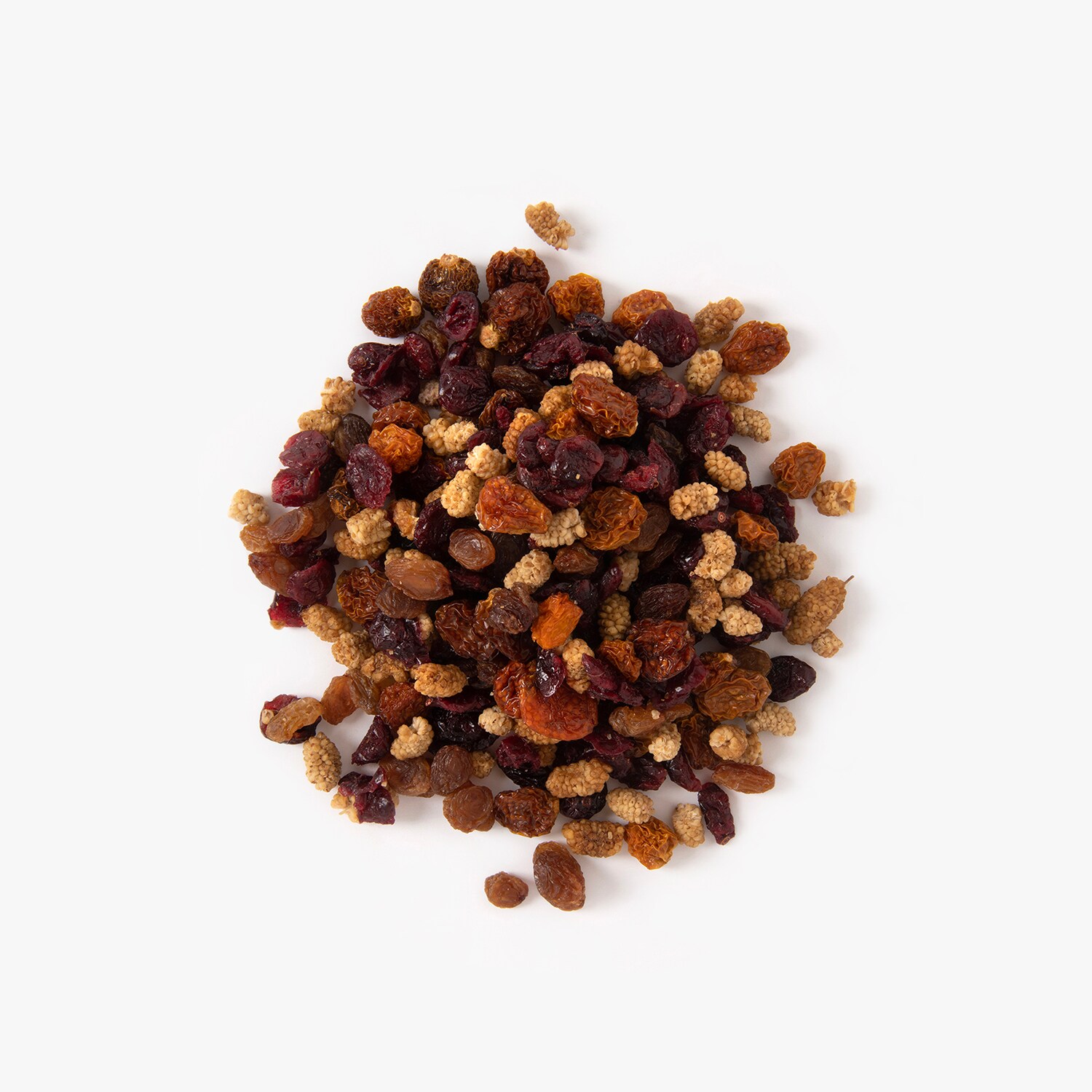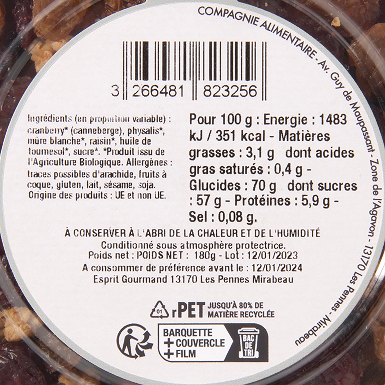 Mélange de cranneberges, physalis, mûres blanches et raisins séchés bio