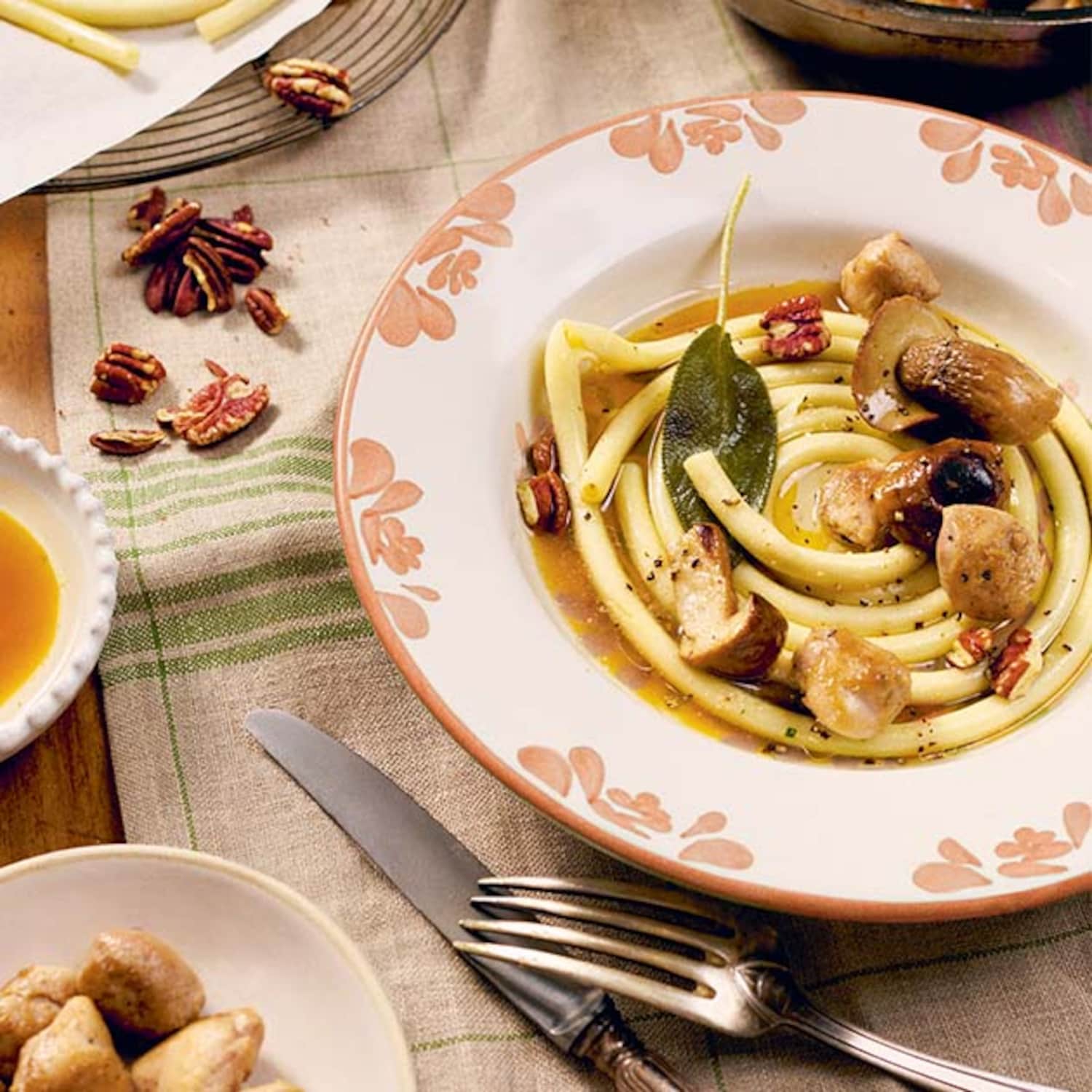 6 pâtes Zitas longues270 g de solt-l'y-laisse de volaille|210 g de crème de noix|160 g de cèpes en morceaux|45 g de noix de pécan|35 g de crème épaisse|25 g de beurre de sarrasin|20 g de pousses d'épinards|15 g de salade Mizuna|12 g de fleur de sel|8 g de germes de moutarde|5 g de poivre mignonnette|12 cl d'huile d'olive|6 cl de vinaigre de Xérès|3 branches de persil plat|1 gousse d'ail